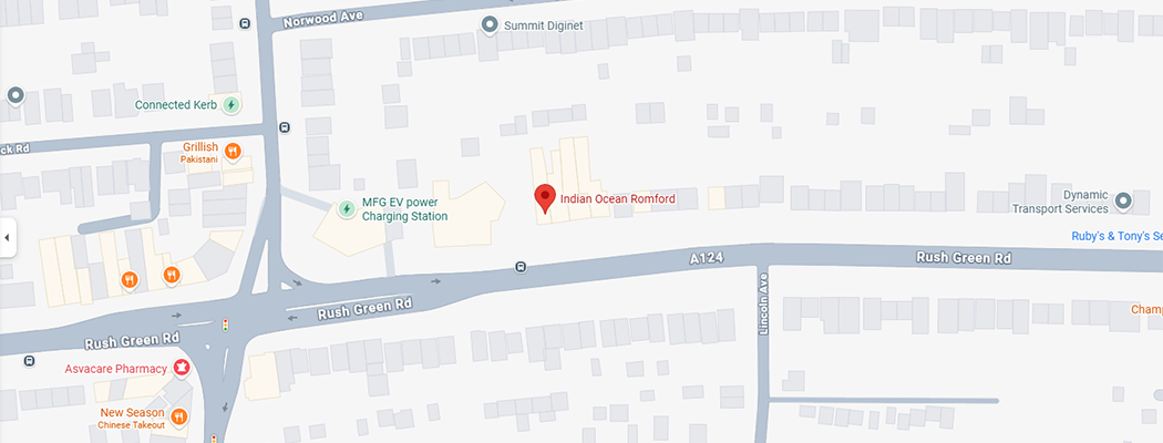 Indian Ocean occupies a convenient position at 146 Rush Green Road, Rush Green, Romford RM7 0QA, providing easy access for residents throughout the borough and beyond. Our location combines the benefits of excellent transport links with the relaxed atmosphere of a neighbourhood setting, making every visit a pleasure.